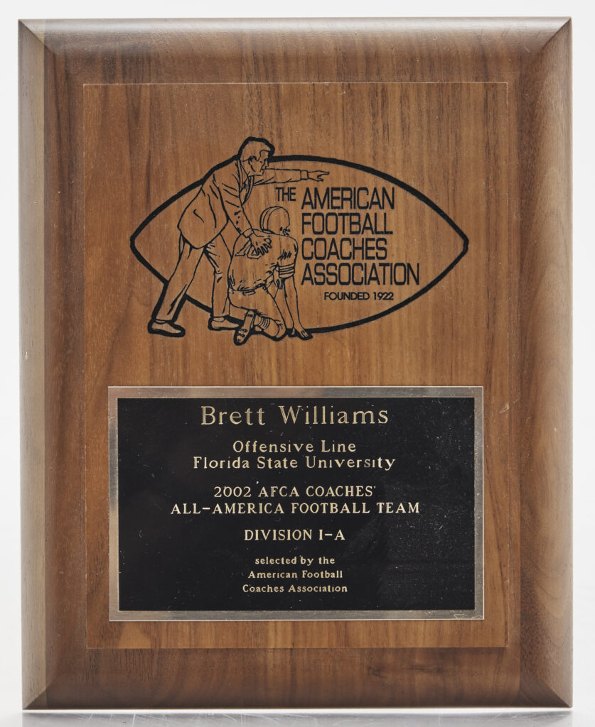 Senior OT Brett Williams was one of college football’s most decorated offensive linemen of the 2002 season. He received this plaque as an AFCA Coaches’ All-American, one of five All-American teams Williams made that year (College Football News First-Team, Sporting News First-Team, AP Second-Team and Sports Illustrated Second-Team). Williams also won the prestigious Jennings Blocking Trophy as the ACC’s top blocker for the second year in a row. The Kissimmee native was a four-year starter at FSU.