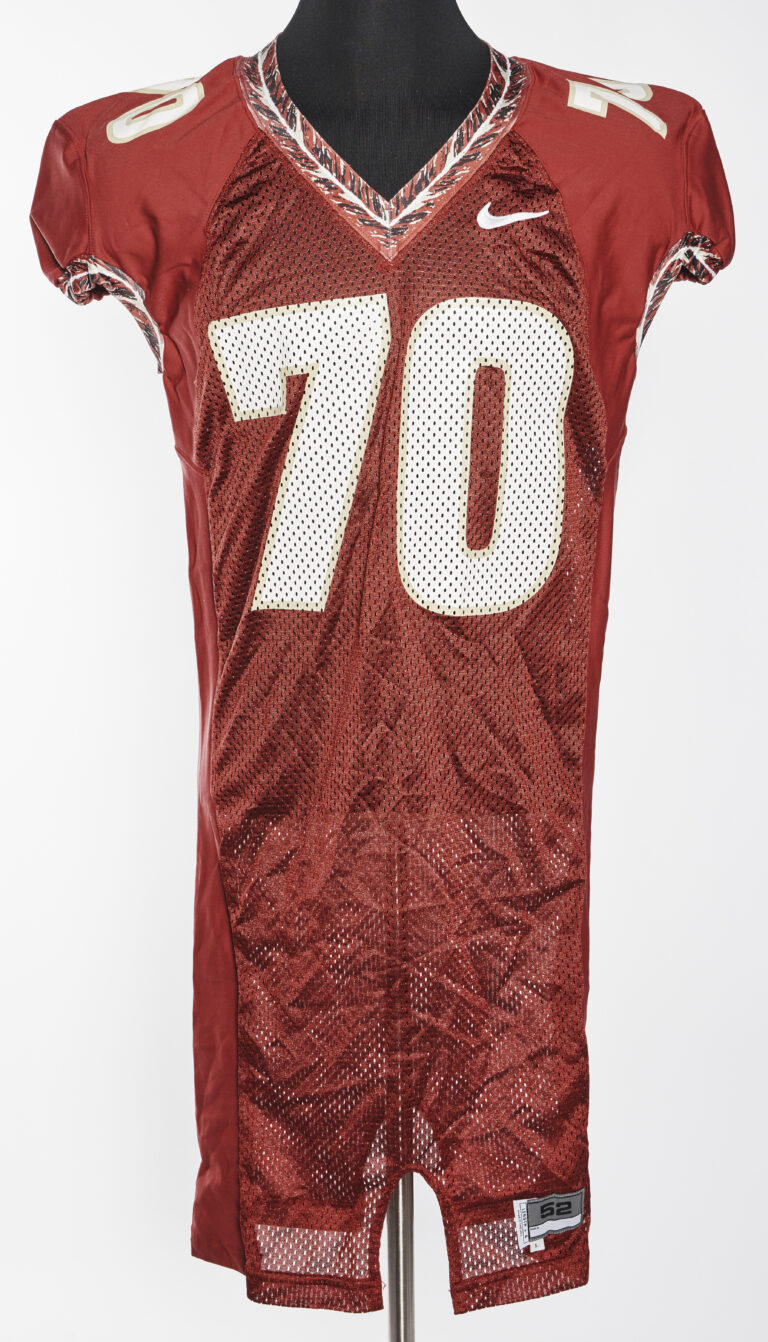 A dominant force on the offensive line, OT Alex Barron was a leader of FSU’s front five during the early 2000s. Hailing from Orangeburg, South Carolina, Barron brought a rare combination of size, speed and skill to the Seminoles after being recruited out of Orangeburg-Wilkinson High School. He was a two-time consensus All-American at FSU and a first-round NFL Draft pick by the St. Louis Rams. This jersey, which was preserved by equipment manager Jimmie Callaway, symbolizes Barron’s legacy in the Garnet and Gold. As Bobby Bowden once said, “Barron was as good an offensive tackle as I ever coached.”