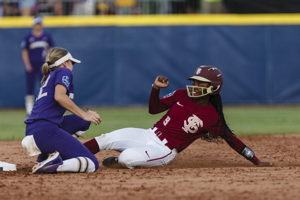 Pinch runner Deja Bush slid into second base during Game 1 of the 2018 Women’s College World Series finals. Entering the game after C Anna Shelnutt drew a one-out walk in the 4th inning, Bush later recorded a stolen base that added to FSU’s aggressive base-running approach. The steal increased the Seminole season total to 148, taking place during a scoreless pitching duel between Meghan King and Washington’s Gabbie Plain. The Noles went on to secure a 1-0 victory, setting the tone for the championship series.