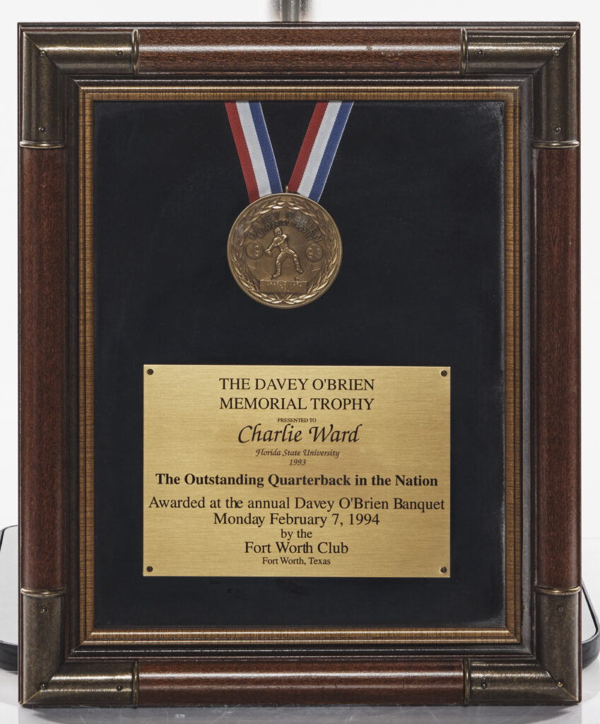 Charlie Ward became the first Seminole to take home the Davey O’Brien Memorial Trophy, given to the nation’s most outstanding college quarterback. In the 1993 season, Ward completed nearly 70 percent of his passes for 3,032 yards and 27 touchdowns. The award was named after TCU star QB Davey O’Brien, who won the Maxwell Award, the Heisman Trophy and a National Championship in 1938. Fifty-five years later, Ward also claimed the Maxwell, Heisman and a national title, along with the O’Brien Trophy.