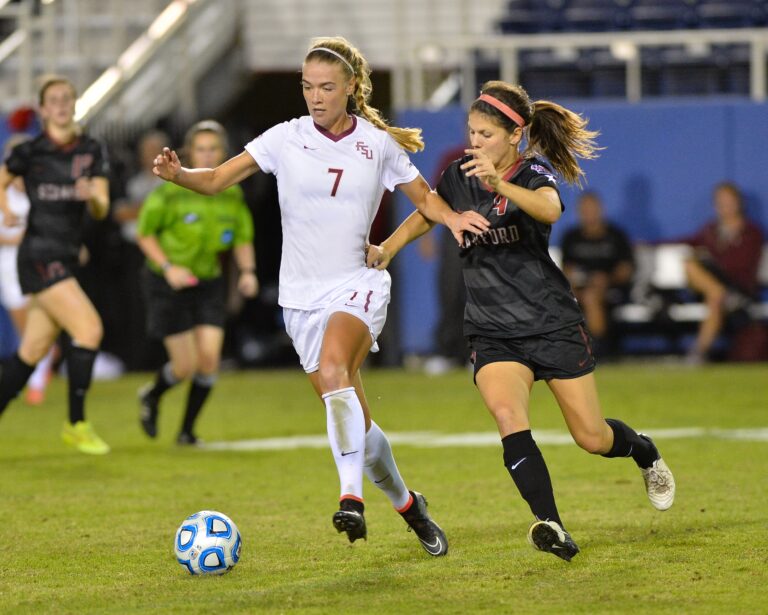 Midfielder Dagny Brynjarsdottir surged forward with the ball against Stanford in the 2014 College Cup Final Four. A MAC Hermann Trophy finalist and first-team All-American, Brynjarsdottir was one of FSU’s most consistent attacking threats, scoring 16 goals during the season. Her skill and composure helped the No. 2 Seminoles control midfield in a 2-0 victory over the No. 3 Cardinal, a result that sent FSU to the National Championship match. Brynjarsdottir finished her FSU career with 44 goals and 111 total points and had 19 game-winning goals.