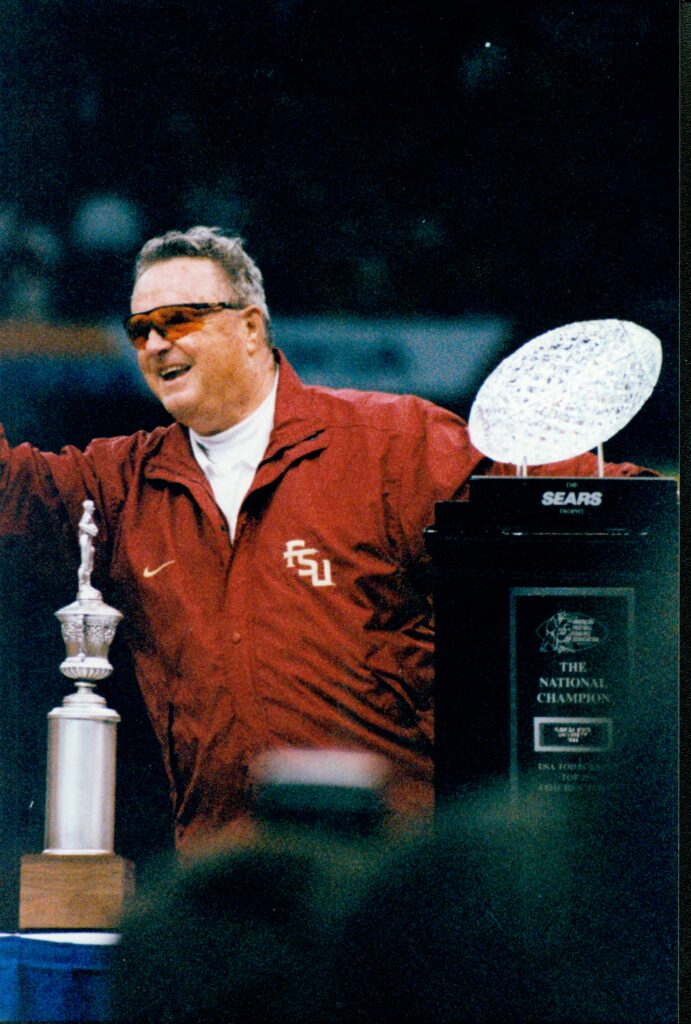 Coach Bobby Bowden was all smiles receiving the 1999 National Championship trophy, FSU’s second title in six years. That season, Bowden led the Seminoles to the first 12-0 season in program history and the first No. 1 wire-to-wire ranking in the AP poll in college football history. Previously, Bowden had placed an empty picture frame on his desk as inspiration to fill it with a photograph of his first undefeated squad. He borrowed the practice from another coach. “So I copied that guy, and I’ve got a blank frame in my office for the first team that I ever coach that goes undefeated,” Bowden said. “I’ve already got the picture, so when I get back I’ll hang it in the office.”