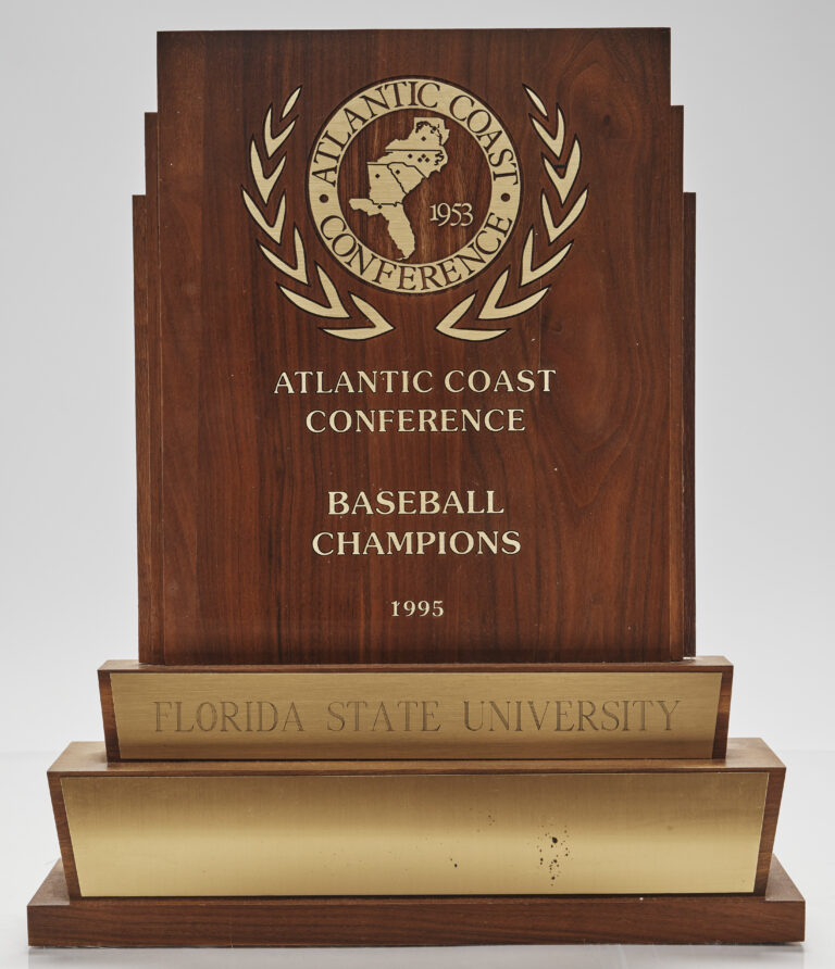 FSU baseball joined the ACC ahead of the 1992 season and earned their first trip to the conference’s championship in 1995. The team defeated Virginia, North Carolina and Clemson to lock up a rematch with Clemson in the ACC Championship series. The Tigers had outscored opponents 43-11 to that point, but facing elimination, the Seminoles were not ones to back down from a challenge. Pitchers Chuck Howell and Jonathan Johnson stymied the Tiger offense over the two-game series. The Seminoles won both games by scores of 12-2 and 8-2, securing the school’s first ACC Championship and earning this trophy. Johnson was named the tournament MVP.