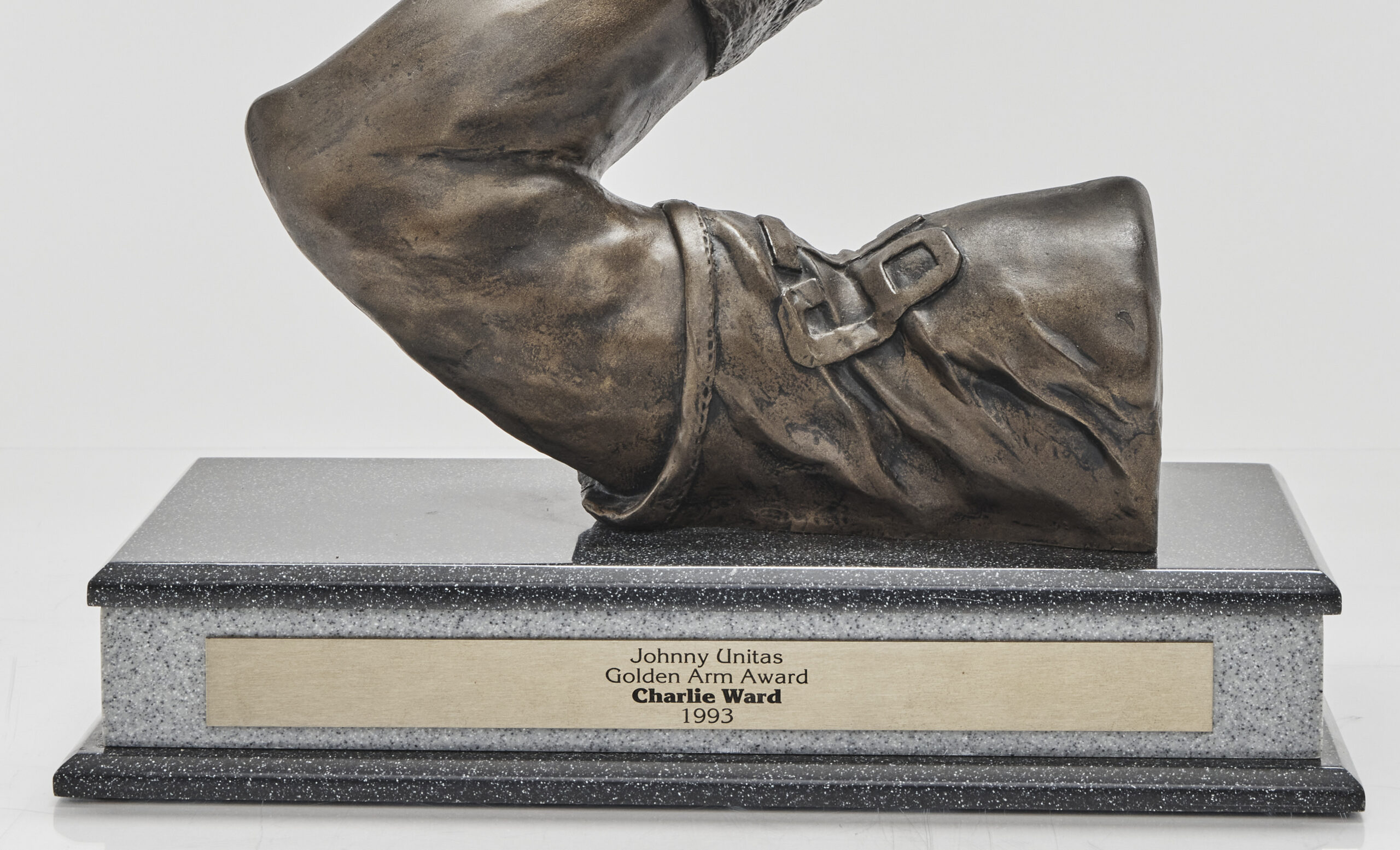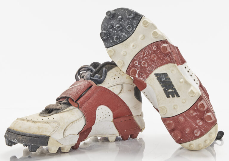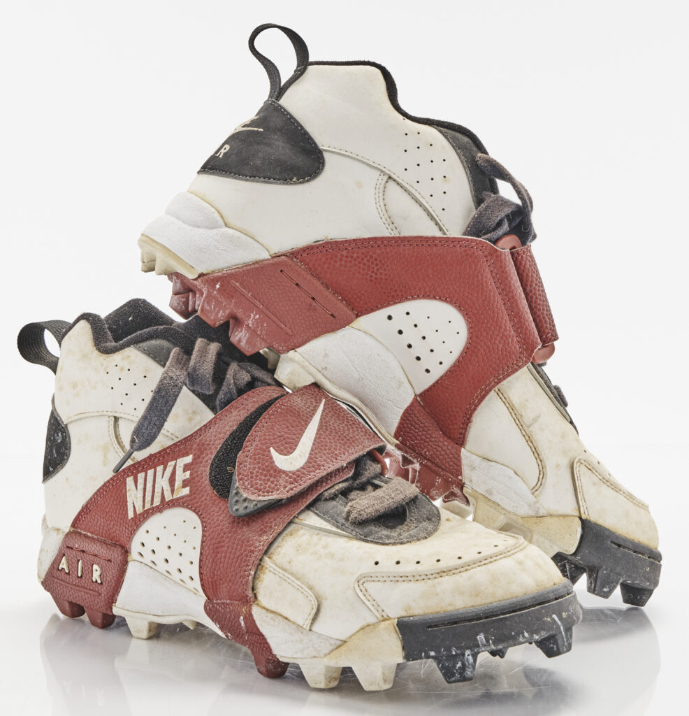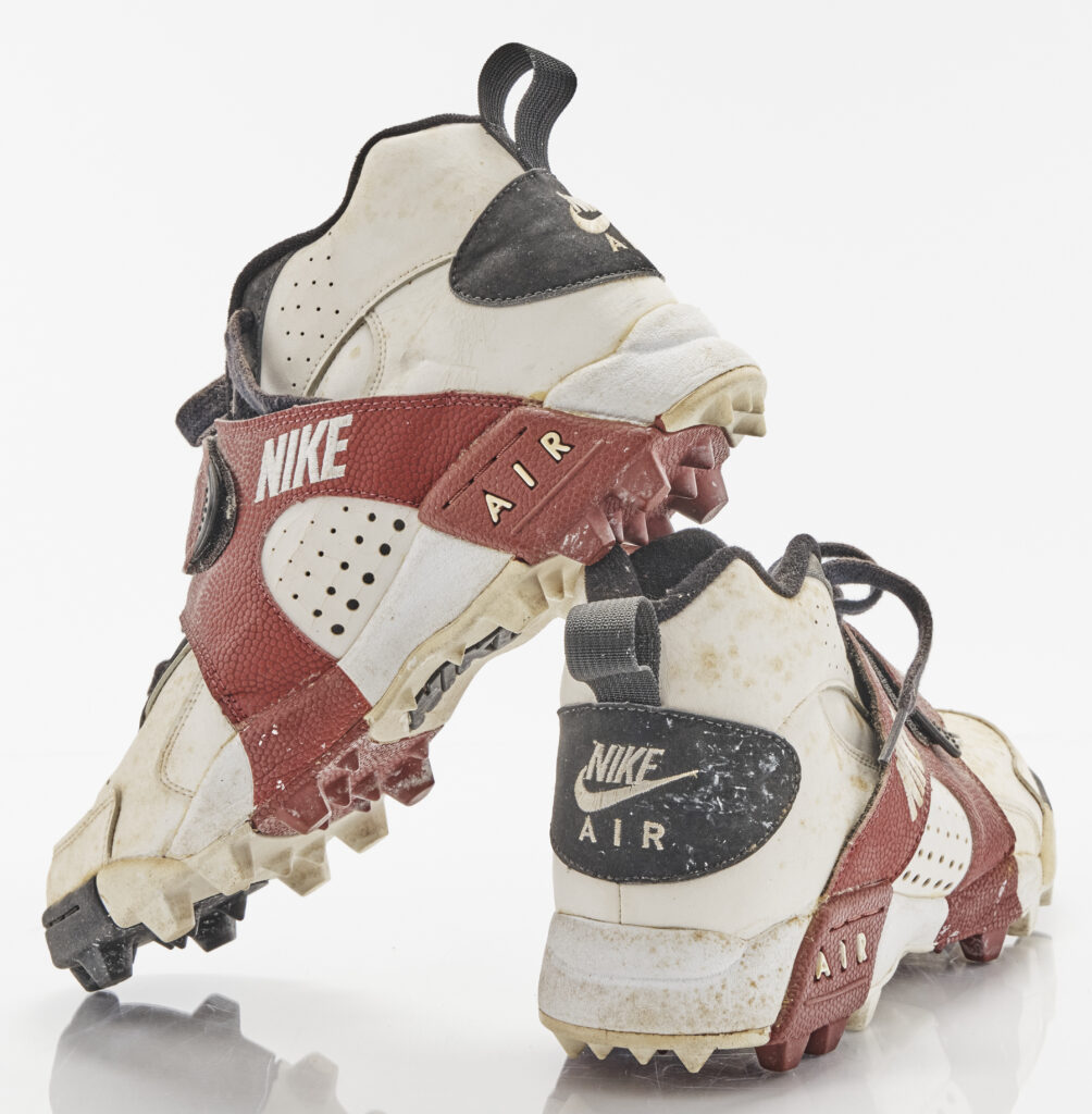 These Nike Air Veer cleats were worn by Heisman Trophy winner QB Charlie Ward during FSU’s national title-clinching Orange Bowl victory over Nebraska on January 1, 1994. The Nike Air Veer gained massive popularity in the mid-1990s, particularly with football players. Pro Football Hall of Fame DL Bruce Smith of the Buffalo Bills famously wore the cleats during his prime. With its distinctive mid-foot strap, bold design and visible Air cushioning, the Air Veer quickly transitioned from a reliable on-field cleat to a sought-after sneaker. Still showing signs of game wear, Ward’s pair captures a moment of Seminole greatness during their 18-16 championship win.