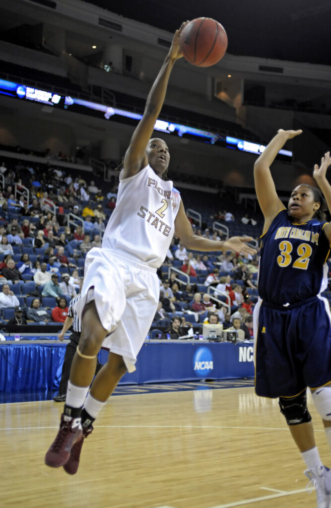 G Alysha Harvin made it look easy as she went for a layup against No. 14 North Carolina A&T in the first round of the 2009 NCAA Tournament. Harvin’s team-high 18 points led No. 3 FSU to an 83-71 victory. “She’s been our fireball as far as being out there like she is,” said teammate Mara Freshour. “She’s undersized, but you would never know it from all the games we play. But we let her know (that we rely on her) in pretty much every game we play.” Though the Seminoles fell short in the second round of the 2009 tournament, Harvin returned for a deeper playoff run in her senior season of 2009-10. In four 2010 NCAA Tournament games, Harvin hit nine shots behind the arc. She finished her career with 117 3-pointers and remains in the program’s top 20.