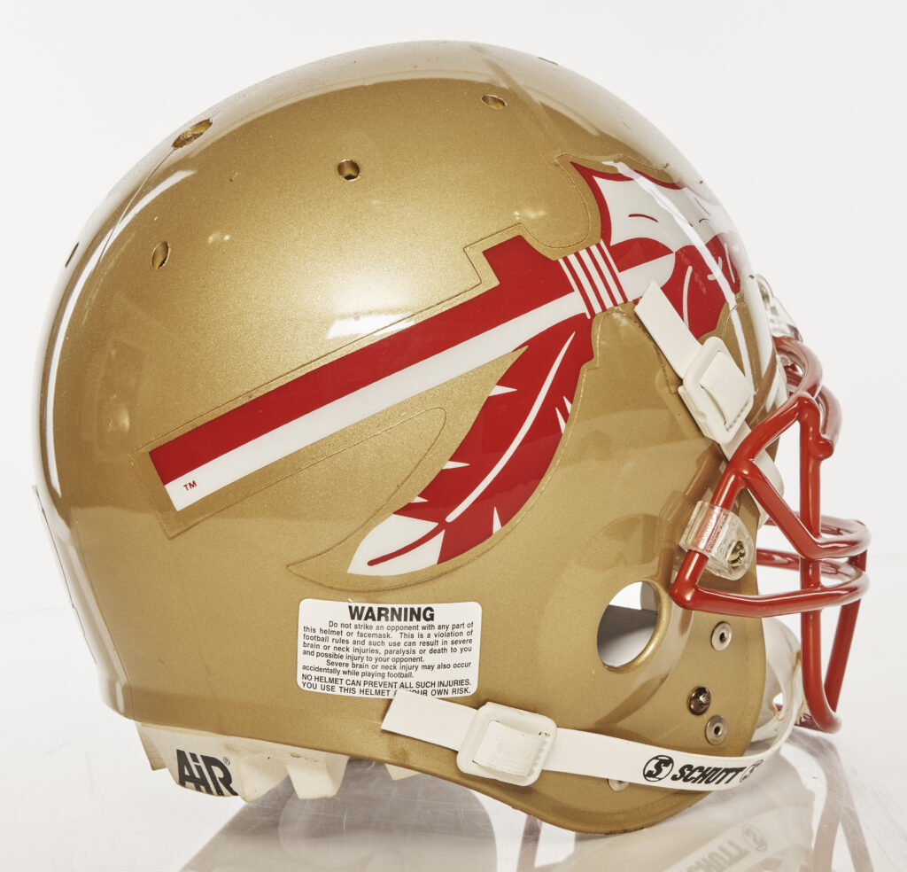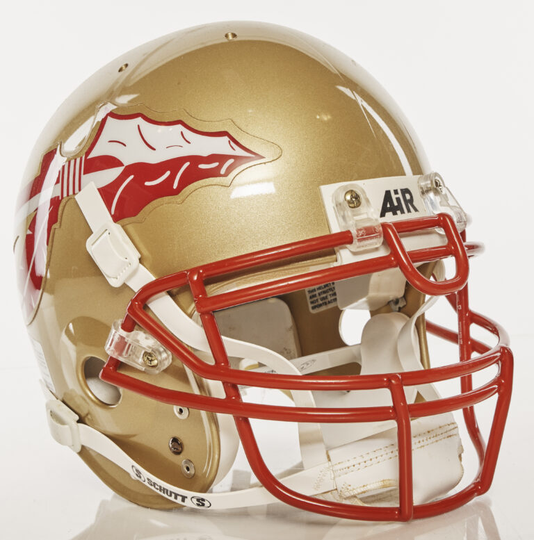 This gleaming gold helmet was on display during the 2001 Hollywood Seminole Spectacular, a high-profile event that blended FSU football with the glamour of Hollywood. Held in Southern California, the fundraiser and celebration brought together Seminole players, coaches, alumni and celebrities for a night of pageantry, pride and support for the football program. The helmet, with its rich metallic finish and classic Seminole spear design, captured the spirit of the occasion: a fusion of tradition and showmanship. Memorabilia from the Hollywood Spectacular remains rare, making this helmet an eye-catching artifact from one of the program’s most unique off-field events.