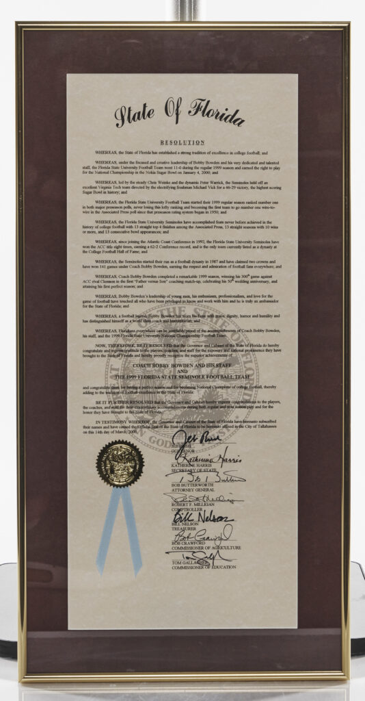 Florida Governor Jeb Bush and other state political leaders signed this resolution, which recognized coach Bobby Bowden and the Seminoles for “having a perfect season and for becoming National Champions of college football, thereby adding to the tradition of football excellence in the State of Florida.” It wouldn’t take long for the document to get to campus — the Florida State Capitol building and Doak Campbell Stadium sit less than two miles away!