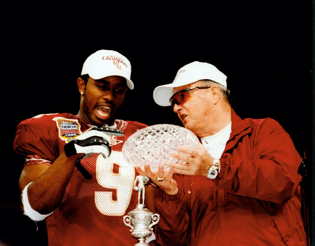 Peter Warrick and coach Bobby Bowden celebrated with the 1999 National Championship trophy, ending an up-and-down season for Warrick with college football’s biggest team honor. Warrick, a star wide receiver who skipped the 1999 NFL Draft with hopes of winning a title that season, was suspended early in the campaign and saw his Heisman stock drop. Yet Warrick remained committed to the Seminoles and keeping the undefeated season alive. He led the team with 934 yards and eight receiving touchdowns, despite the two-game suspension. In the Sugar Bowl, a 46-29 victory for the Noles, Warrick scored a record 20 points and was named the game’s MVP. “I came back because I love coach Bowden, and I love everyone on the team with us,” Warrick said. “When I got in that trouble, Coach B. stepped it up for me. I won this game for him.”