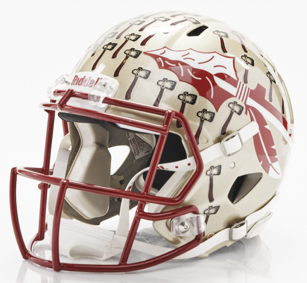 Jameis Winston put on this helmet while quarterbacking the Seminoles in the 2014 BCS National Championship game. Down by four points with 79 seconds left, Winston led the team down the field, tossing a 2-yard touchdown to WR Kelvin Benjamin and securing FSU’s third National Championship in program history. For his winning efforts, Winston was named the Offensive MVP of the game. It was another award to add to his overflowing trophy case that season, which included the coveted Heisman. Head coach Jimbo Fisher praised the quarterback, saying, “It was the best football game he’s played all year and I’ll tell you why, because for three quarters he was up and down and he fought.”