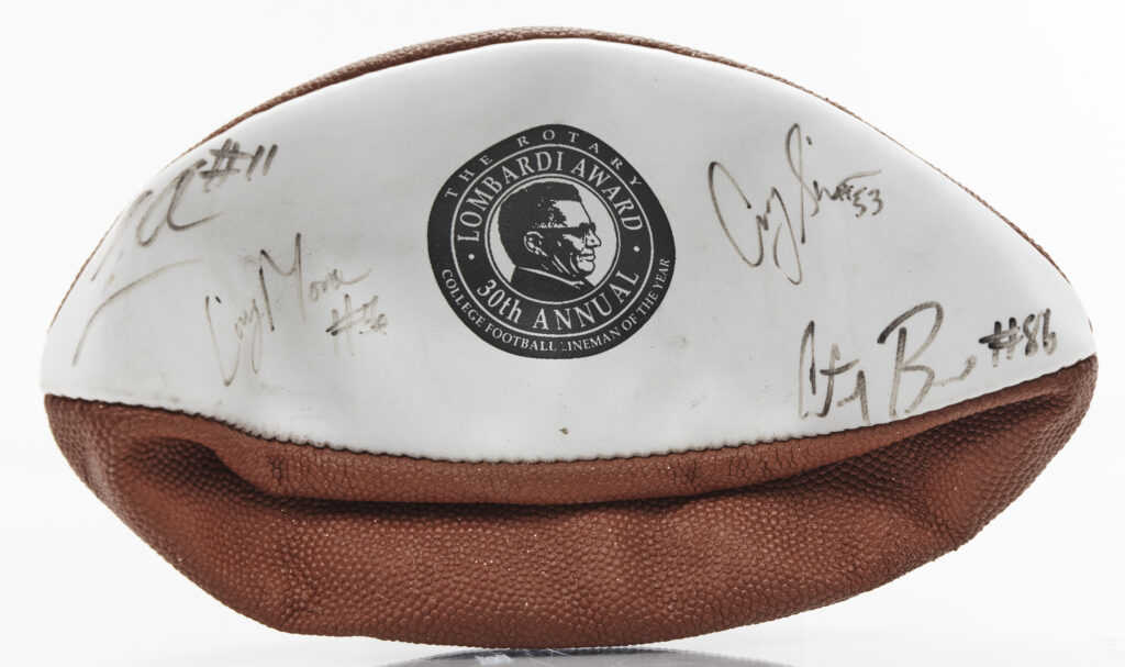 This football from the 30th Annual Lombardi Award ceremony is autographed by four of college football’s most dominant defensive players from the 1999 season — Corey Simon (FSU), Corey Moore (Virginia Tech), LaVar Arrington (Penn State) and Courtney Brown (Penn State). Simon, FSU’s powerful senior nose guard, anchored a defense that helped lead the Noles to a perfect 12-0 season and a spot in the BCS National Championship game. After playing a major role in the Seminole national title run, Simon would go on to be a first-round NFL draft pick. Though Moore of Virginia Tech ultimately won the Lombardi Award that year, the presence of all four finalists on this single football speaks to the elite level of defensive talent in college football that season.