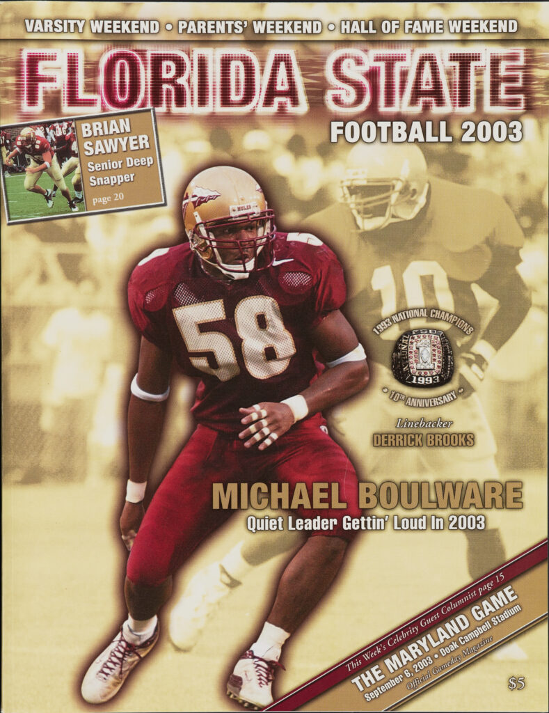 The 2003 season was chock-full of record-setting moments and player accolades to remember. In a victory over Wake Forest, FSU gained 216 yards on punt returns, setting a program record for most punt return yards in a single game. During a win over Florida just a few weeks later, the Seminoles gained 215 yards on kickoff returns, another program record. Individually, Michael Boulware shined as an All-ACC First-Team selection. The linebacker compiled a team-leading 111 tackles along with 2.5 sacks. Additionally, DT Darnell Dockett was named ACC Defensive Player of the Year and OT Alex Barron earned consensus All-American honors.