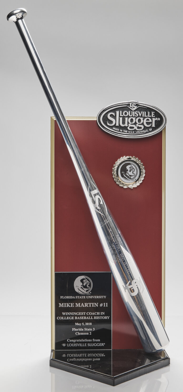 On May 5, 2018, Mike Martin made college baseball history with his record-breaking 1,976th career win. Louisville Slugger honored his achievement with this custom Silver Slugger award. Martin was a crucial part of the Seminole baseball program for most of its modern history. He played center fielder from 1965 to 1966, joined the staff as an assistant coach in 1975 and became head coach in 1980. By the time Martin reached the NCAA all-time wins record, he had been involved in over 3,000 games out of the more than 4,000 in program history, as well as 46 seasons out of the program’s 71 years. “[Martin] literally transformed Florida State baseball into what it is,” said former OF J.D. Drew.