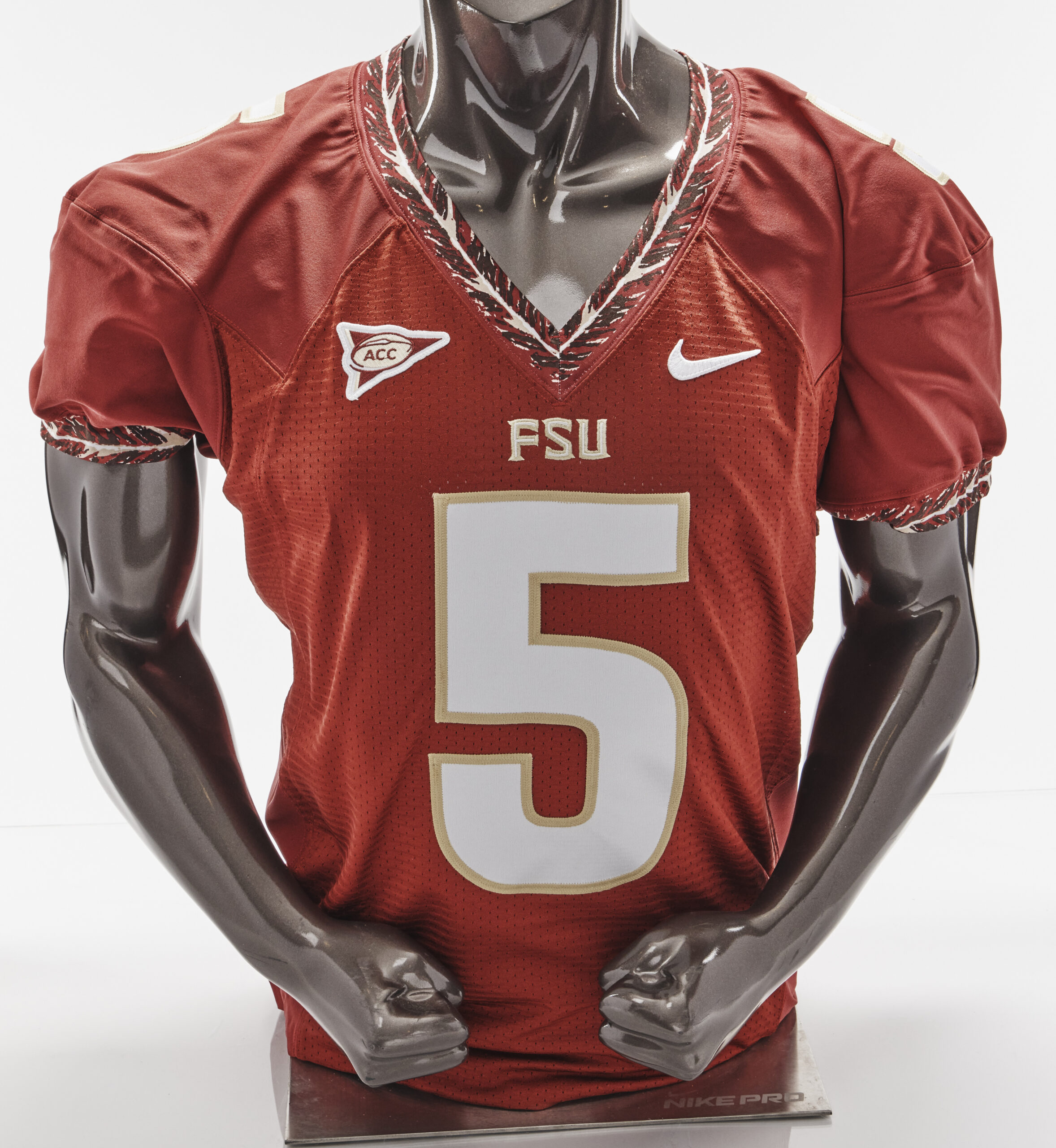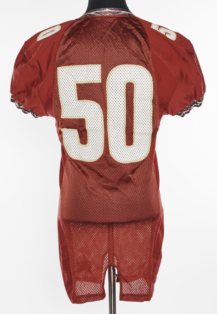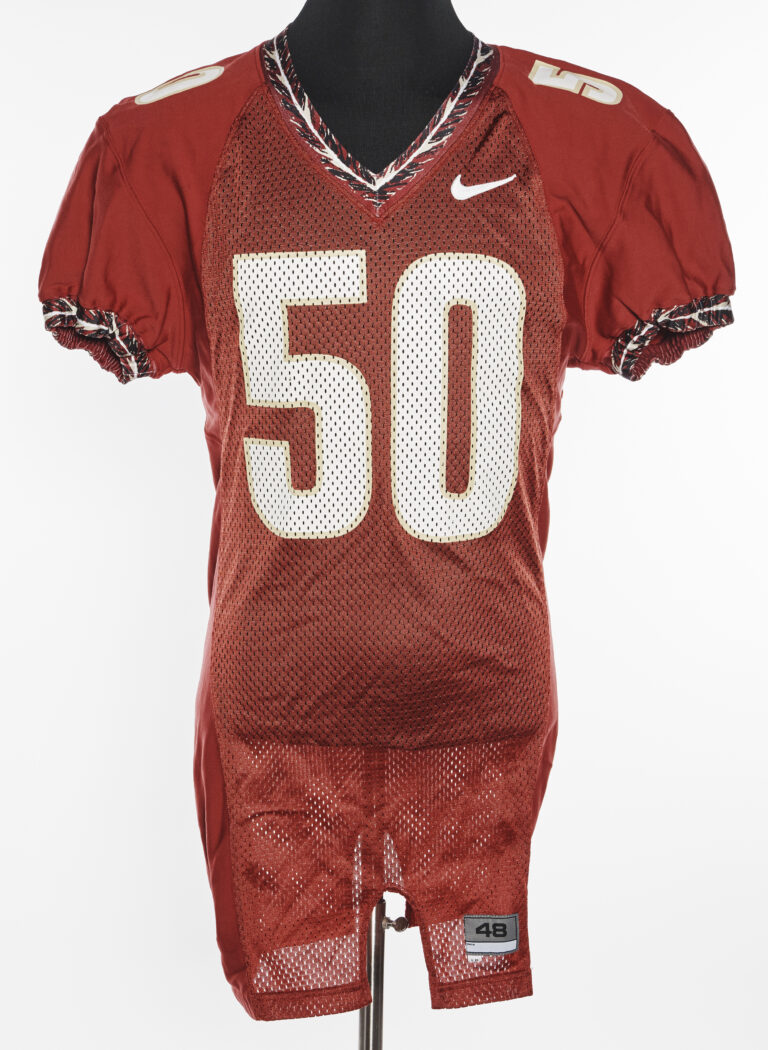 Offenses didn’t just game-plan for NG Ron Simmons — they braced for him. FSU’s No. 50 was a nightmare in the trenches, delivering hits that left ball carriers dazed and quarterbacks desperate to escape. On October 29, 1977, in a dominant 35-14 win over North Texas State at home, Simmons racked up five sacks, a then single-game record. His performance helped establish the Seminoles as a rising national force, and his reputation as a wrecking ball in garnet cemented him as a college football legend. The bold collar design on this jersey reflects a player who didn’t just play with power, but also with punishing presence. Simmons would go on to compete as a professional wrestler with World Championship Wrestling (WCW), World Wrestling Federation (WWF) and World Wrestling Entertainment (WWE).