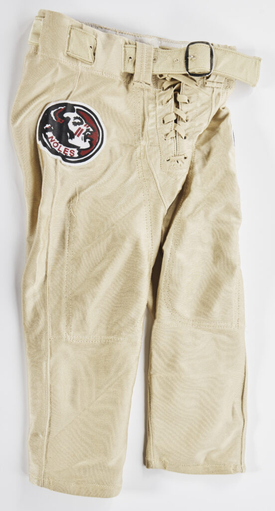 These football pants were worn by All-American kicker Sebastian Janikowski during his time at FSU in the late 1990s. Janikowski, who was born in Walbrzych, Poland, played only one year of high school ball before joining the FSU team. Known for his booming leg and larger-than-life personality, Janikowski helped solidify FSU’s dominance under Bobby Bowden. He became the first kicker ever selected in the first round of the NFL Draft in 2000, after Janikowski won back-to-back Lou Groza Awards in 1998 and 1999. Bowden once said of him, “He could kick it from Tallahassee to Tampa if we needed it.”