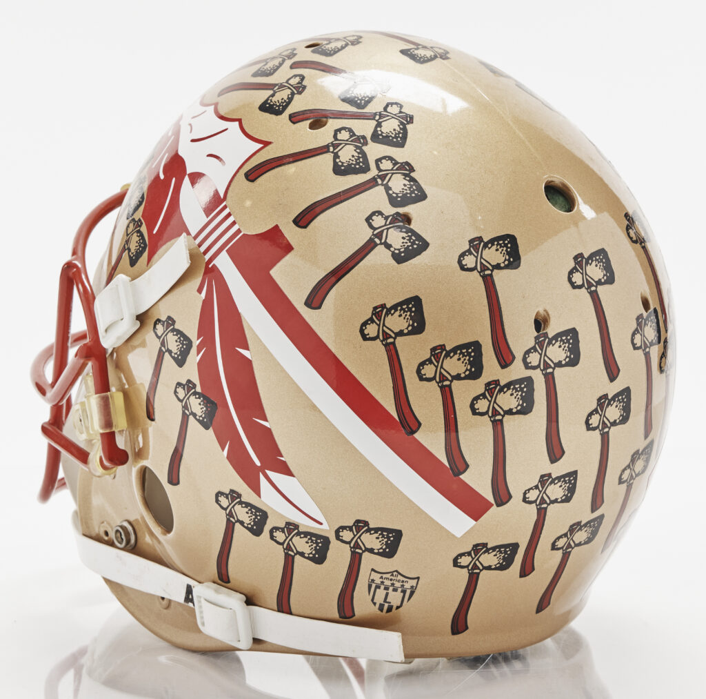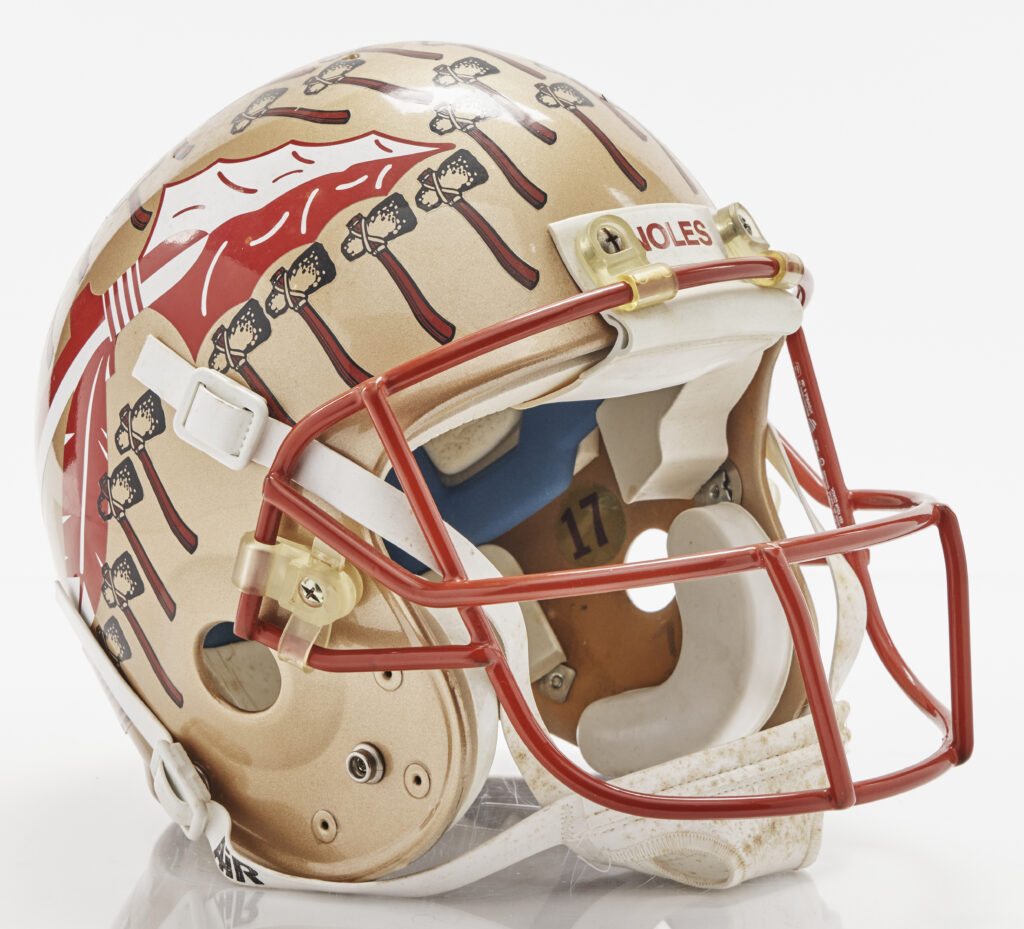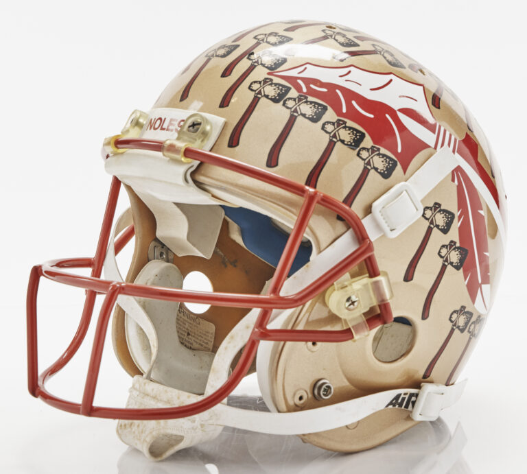 This gold helmet, adorned with tomahawk decals for accomplishments on the field, was worn by QB Charlie Ward during the Orange Bowl on January 1, 1994. The helmet shows signs of game wear from FSU’s gritty 18-16 win over Nebraska, a victory that secured the first national title in Seminole history. Ward, who battled through sacks and late-game pressure, cemented his legacy as one of college football’s great leaders.
