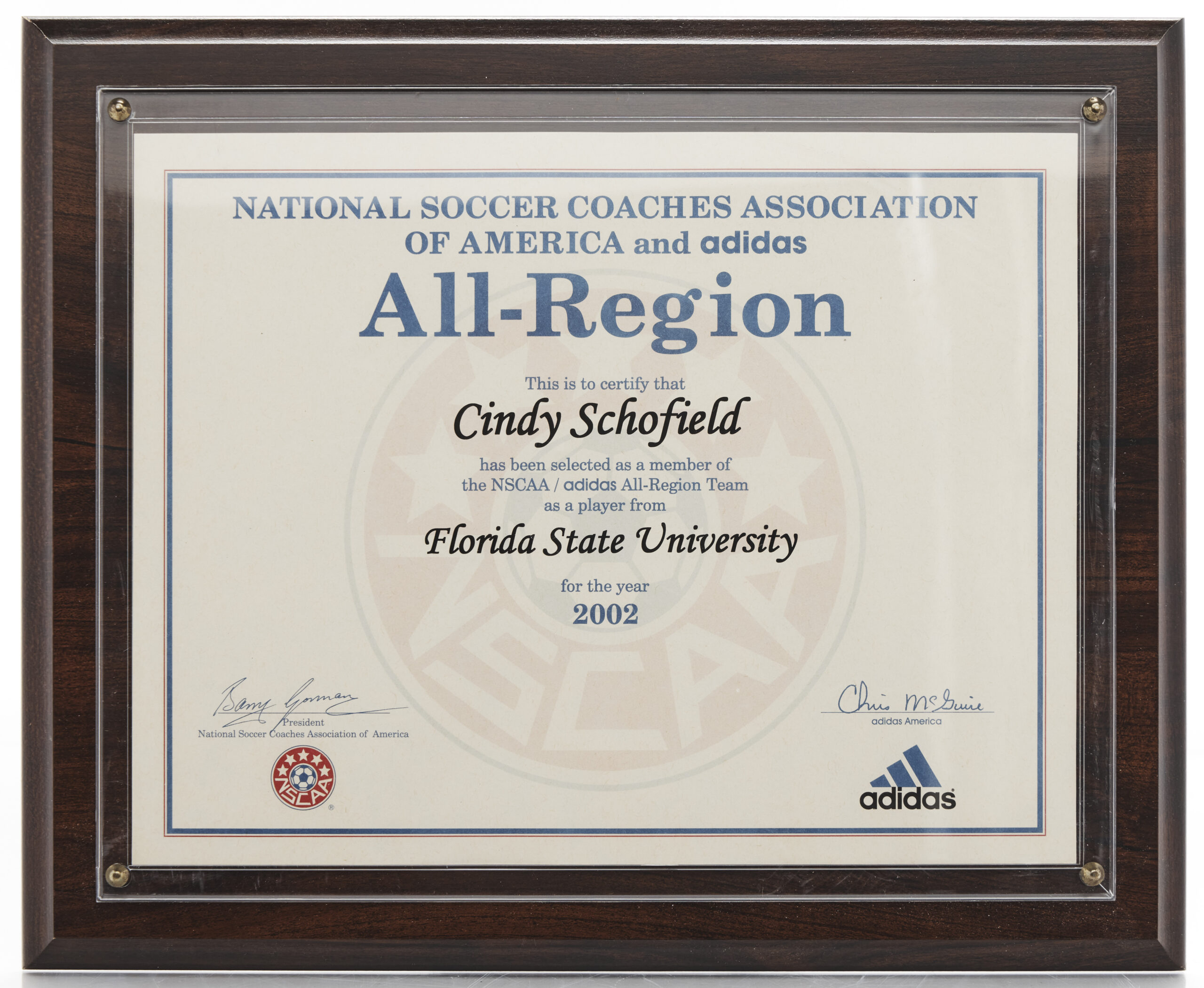 This NCAA Statistical Champion plaque commemorates FSU’s dominance in 2014, when the Seminoles compiled a .942 winning percentage with a 24-1-1 record. The season featured a program-best 19 shutouts and a balanced attack that produced 61 goals. No. 2 FSU swept through the NCAA Tournament with five straight clean sheets before defeating No. 4 Virginia 1-0 in the College Cup Championship Game. In doing so, FSU became just the third school in NCAA history to win a national title without allowing a goal throughout the tournament — a defensive performance that remains one of the best in college soccer history.
