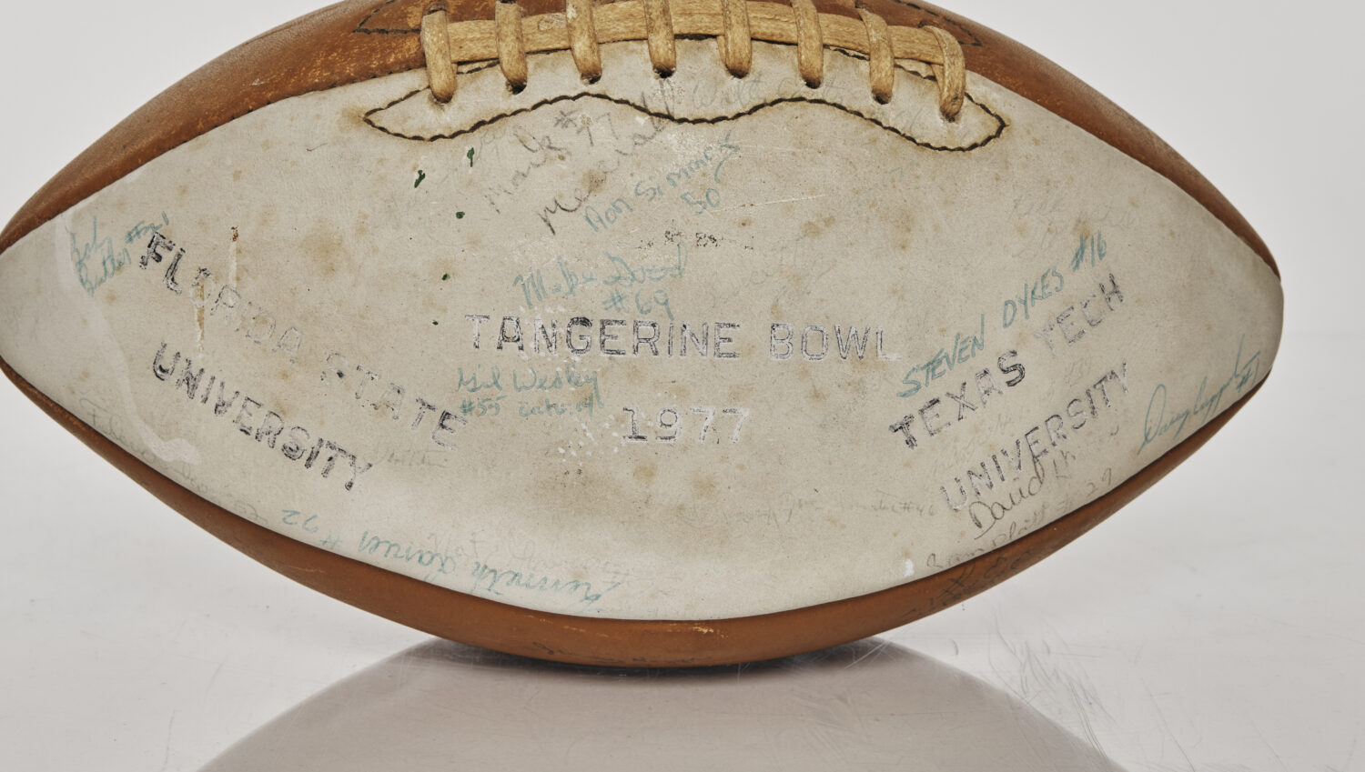 This autographed football commemorates FSU’s 40-17 victory over Texas Tech in the 1977 Tangerine Bowl, played on December 23 in Orlando, Florida. The ball is signed by members of the Seminole team tha ...