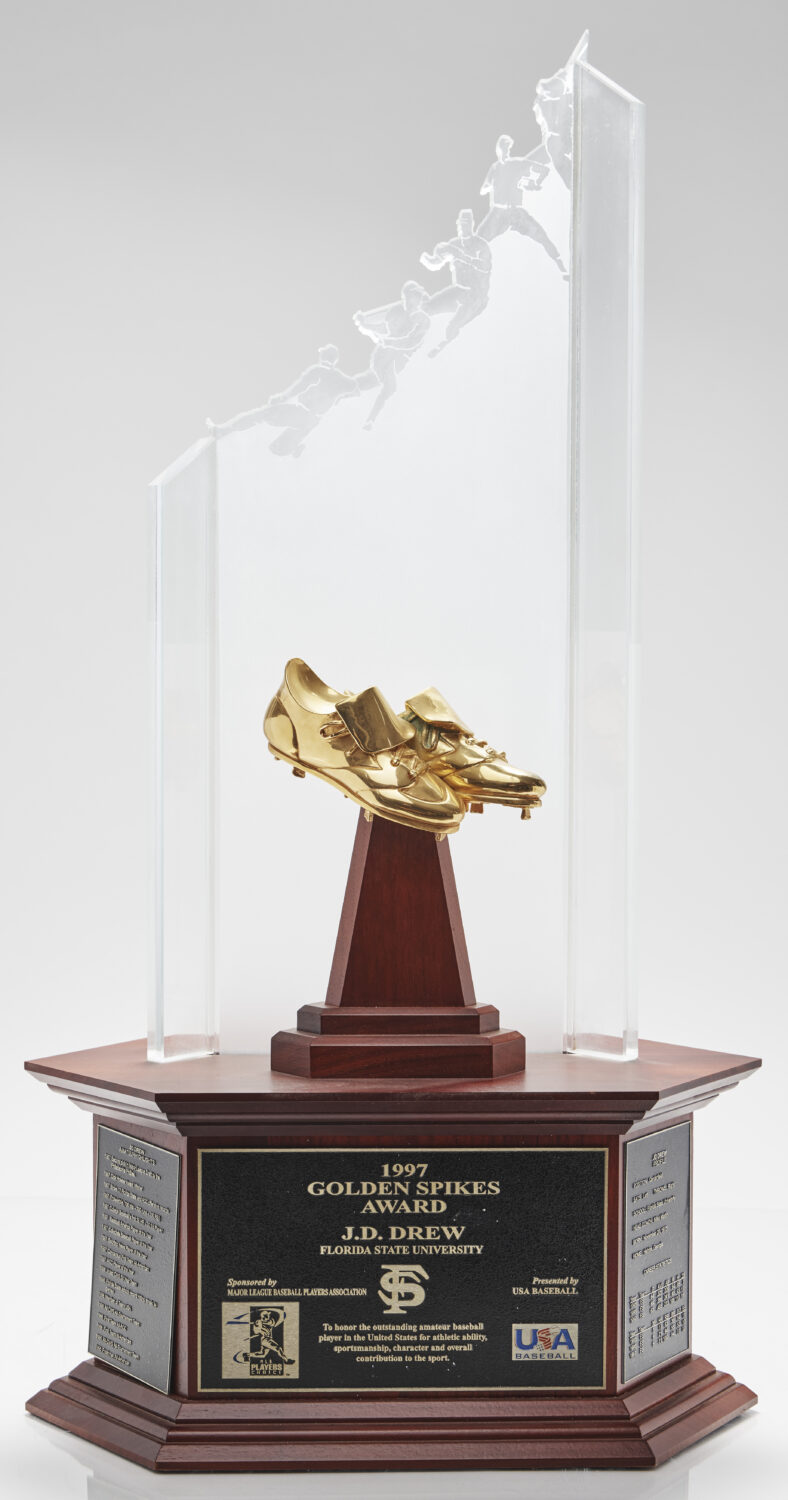 This 1997 Golden Field Award from USA Baseball recognized fielding Golden Spikes winner J.D. Drew. By winning the award, Drew brought renewed national acclaim to the Seminole baseball program. He achi ...