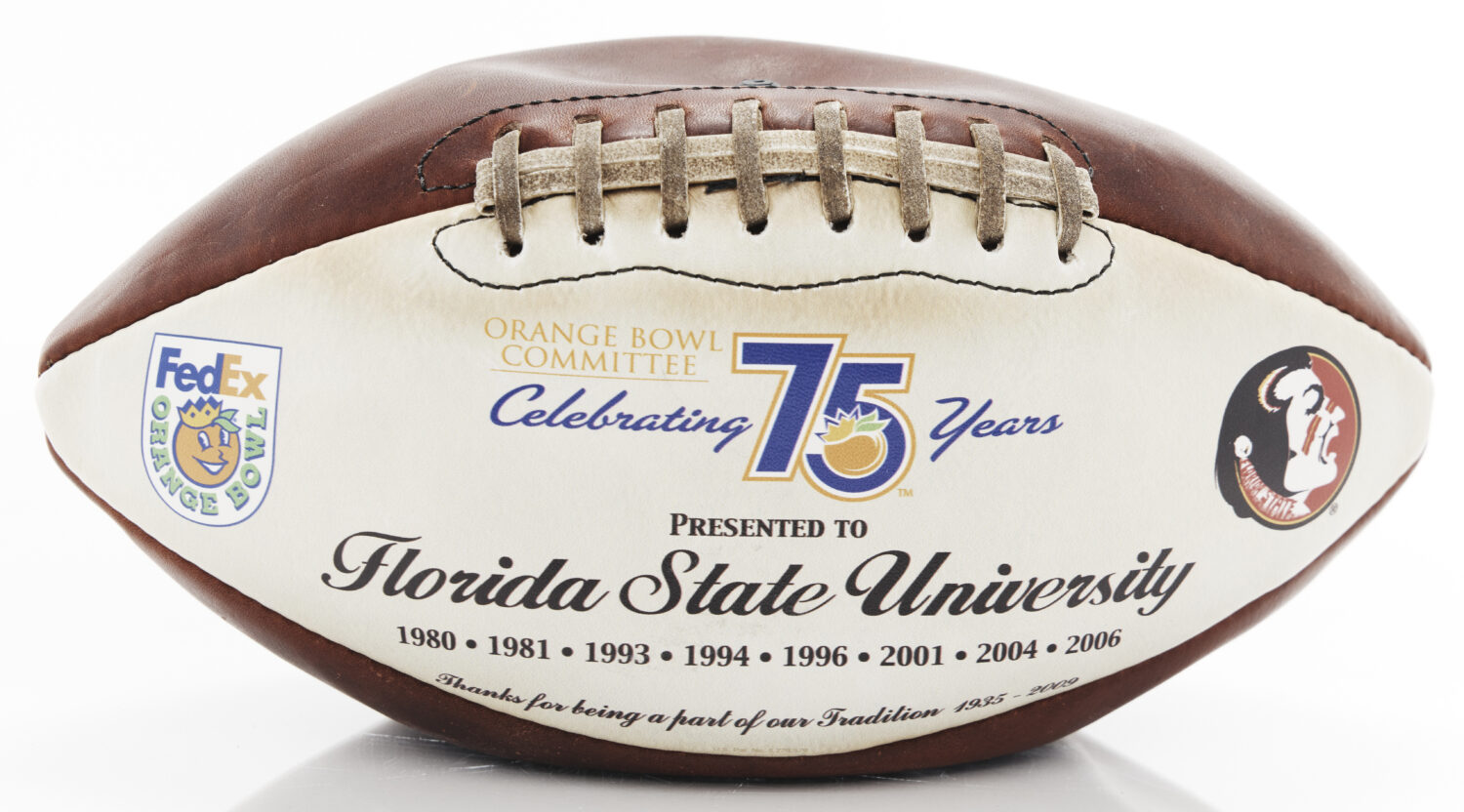 Presented to FSU by the Orange Bowl Committee in 2009, this commemorative football celebrates the program’s longstanding relationship with one of college football’s most storied postseason games. The ...