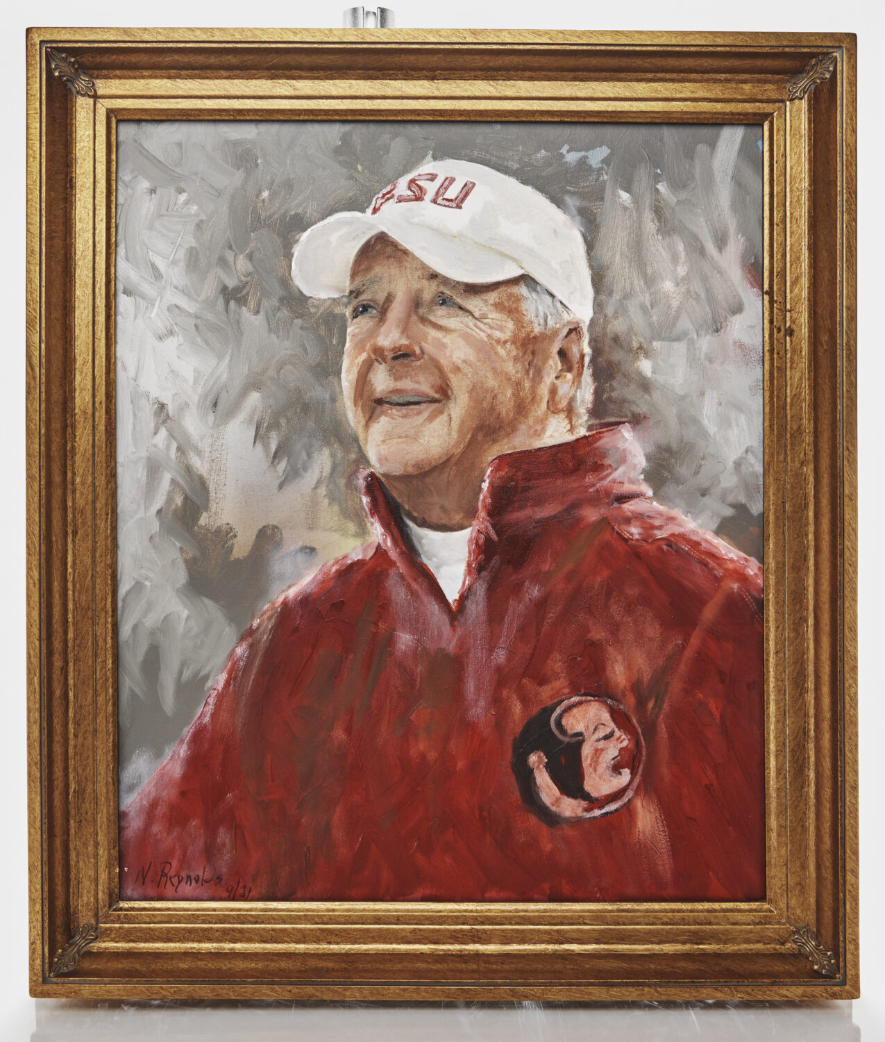 Painted in September 2021 by artist N. Reynolds, this brush portrait of Bobby Bowden captures the legendary coach in a familiar pose — relaxed and resolute, clad in an FSU windbreaker and white Semino ...