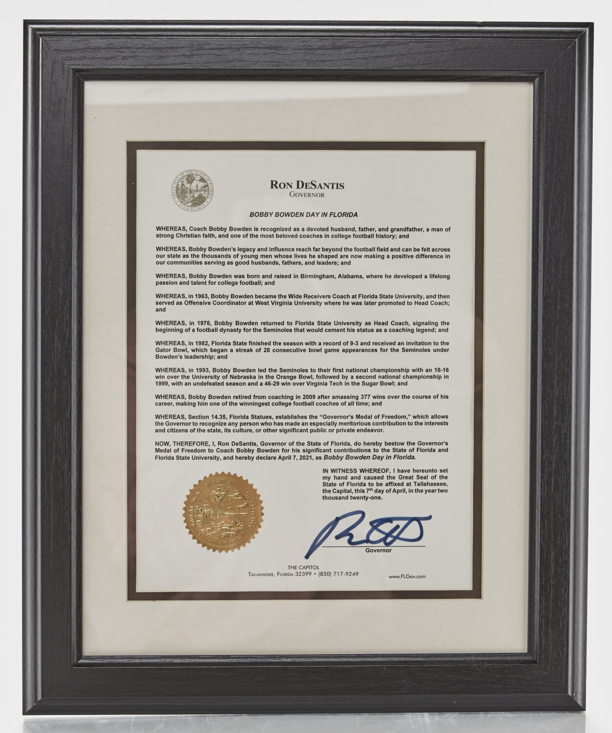 On April 7, 2021, Governor Ron DeSantis issued an official proclamation declaring the date as “Bobby Bowden Day in Florida.” The honor celebrated Bowden’s extraordinary legacy as a coach, mentor and r ...
