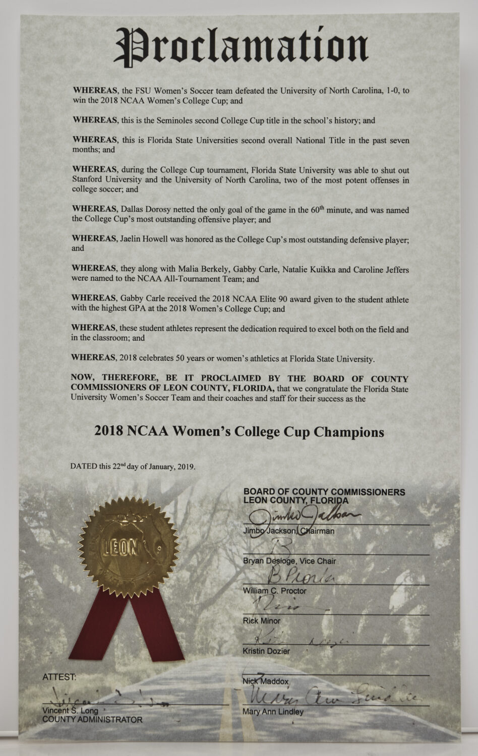 After claiming the second National Championship in program history, the Board of County Commissioners — located in FSU’s home of Leon County — applauded the Seminoles for a season of success. The proc ...