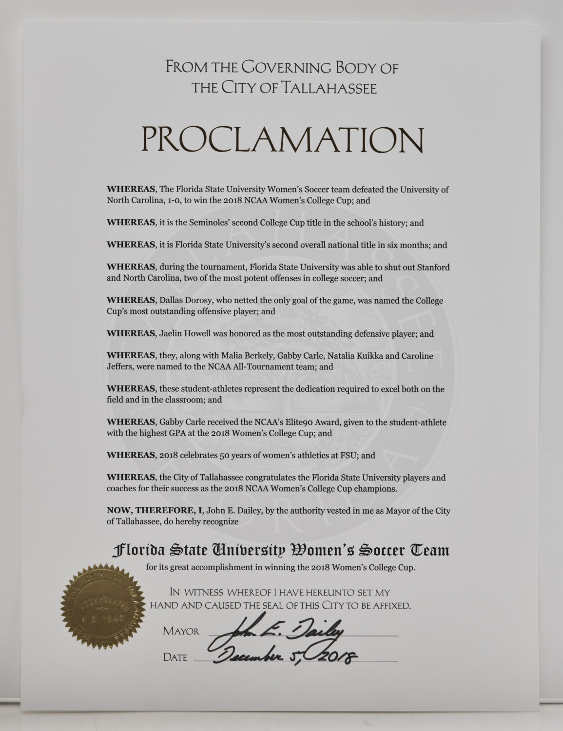 The City of Tallahassee wasted no time issuing a proclamation celebrating the 2018 National Championship. Mayor John E. Dailey, an alumni of FSU, signed this document celebrating the winners of the 20 ...