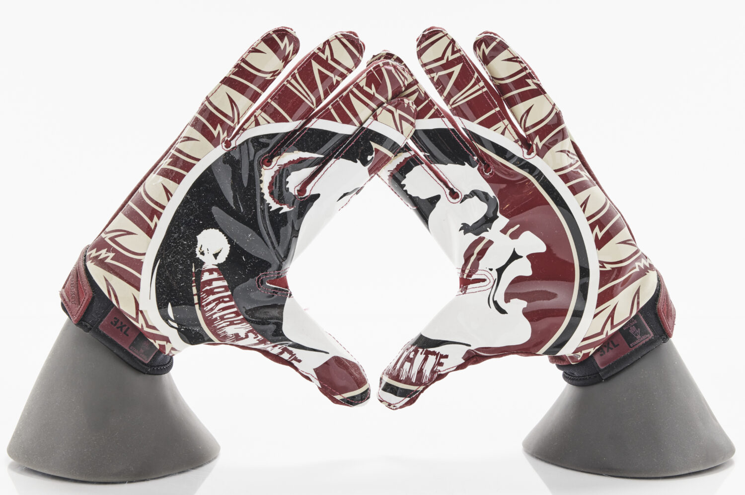 WR Kelvin Benjamin wore these gloves when he caught a touchdown pass from QB Jameis Winston with 13 seconds remaining in the 2014 BCS National Championship Game to give FSU a three-point lead and, ult ...