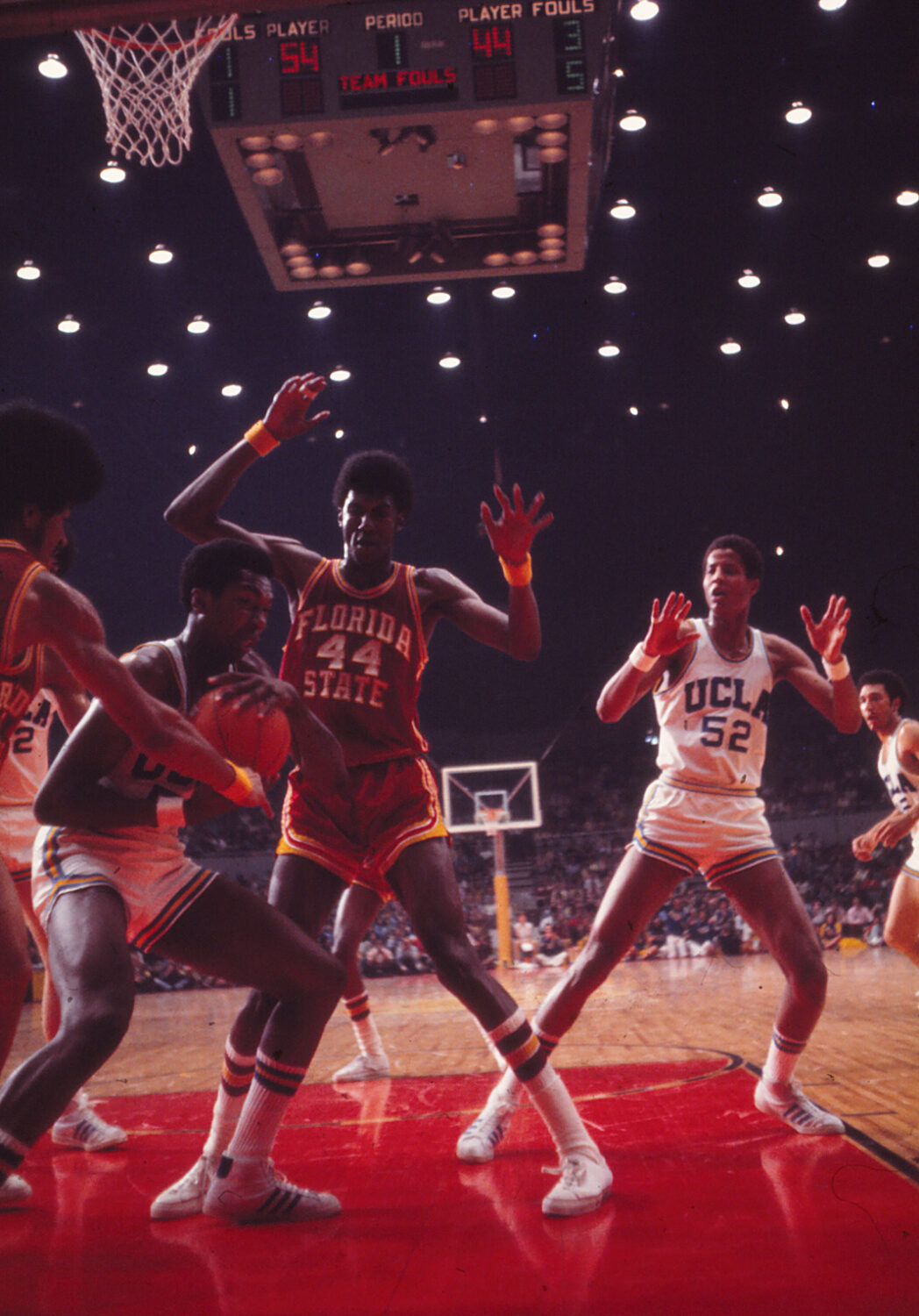 In this action shot from the 1972 National Championship Game, Seminole C Lawrence McCray (No. 44) battled inside against UCLA’s Keith (later Jamaal) Wilkes (No. 52). A 6-foot-11, 210-pound product of ...