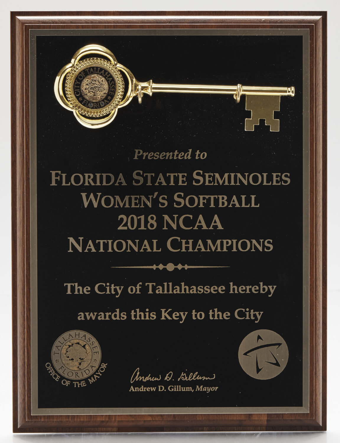 This plaque commemorates the City of Tallahassee awarding a key to the city to the FSU softball team following their 2018 NCAA National Championship. The honor recognized Florida State’s first NCAA so ...